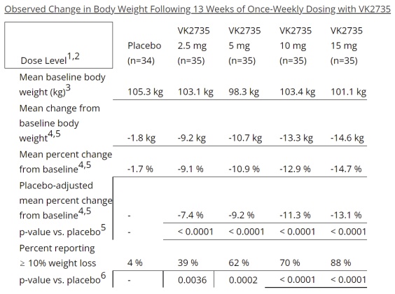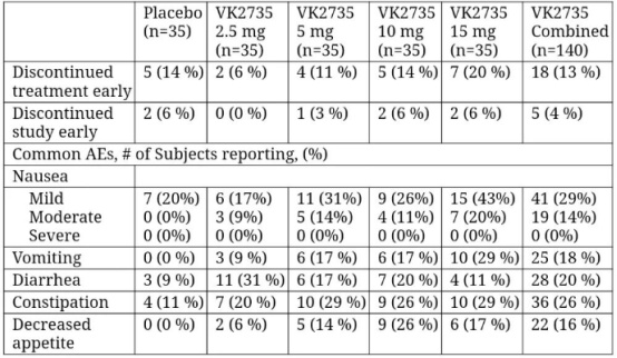 此外,该研究显示VK2735的安全且耐受性良好,大多数治疗紧急不良事件(TEAE)为轻度或中度。