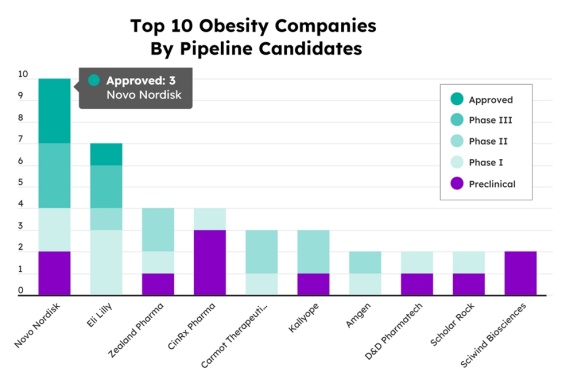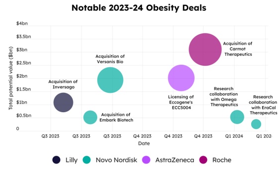 其中包括礼来10.8亿美元对价收购Inversago,诺和诺德29.8亿美元收购三家企业,以及其花费2.6亿美元与EraCal展开的技术合作。另外,阿斯利康耗资20.1亿美元收购Eccogene的减肥药资产ECC5004而罗氏则通过并购Carmot Therapeutics跻身减肥药赛道。