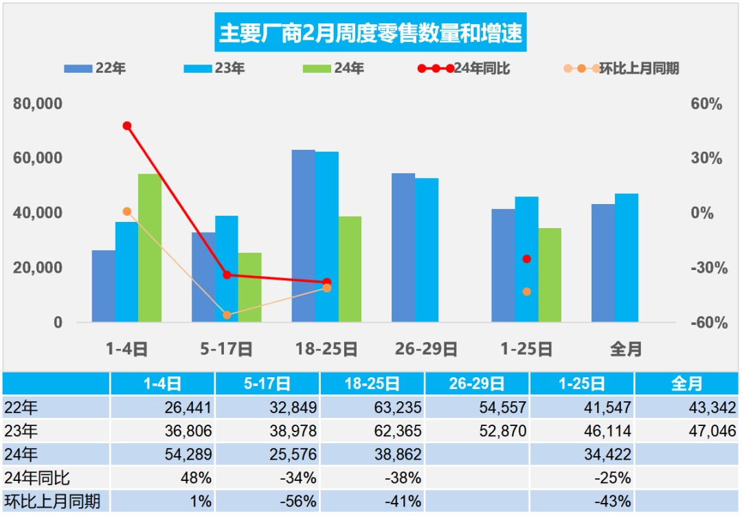 2月1-25日,乘用车市场零售86.1万辆,同比下降25%,较上月同期下降43%;今年以来累计零售289.5万辆,同比增长19%。