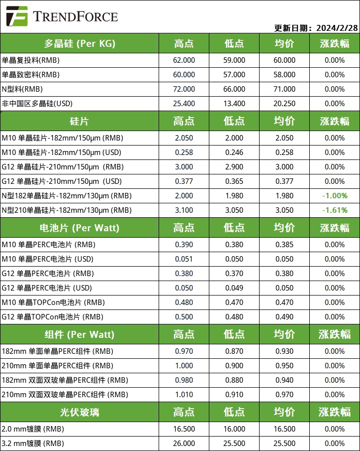 智通财经APP获悉,根据TrendForce集邦咨询旗下新能源研究中心2月28日最新报价,光伏产业链整体价格持稳不变。单晶复投料主流成交价格为60元/KG,单晶致密料的主流成交价格为58元/KG;N型料报价71元/KG。