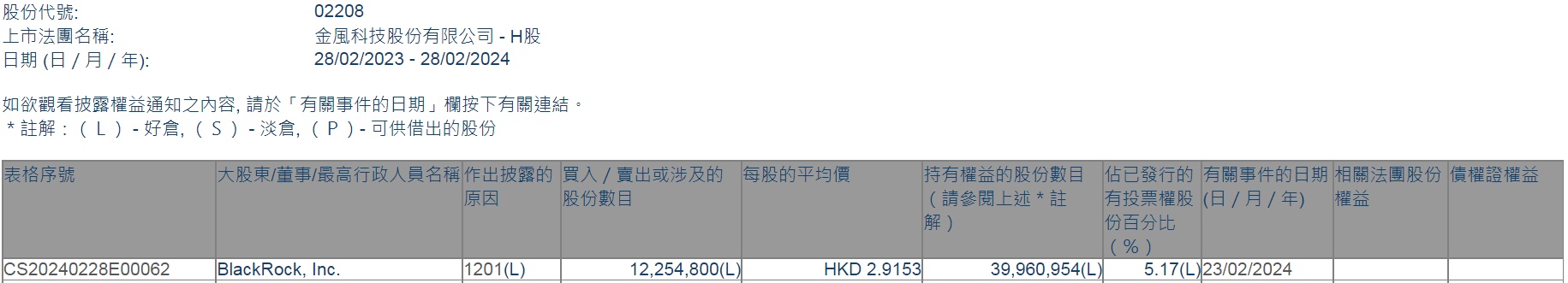 智通财经APP获悉,香港联交所最新资料显示,2月23日,贝莱德减持金风科技(02208)1225.48万股,每股作价2.9153港元,总金额约为3572.64万港元。减持后最新持股数目约为3996.1万股,最新持股比例为5.17%。