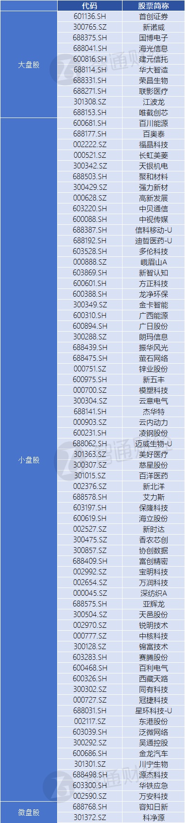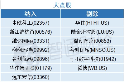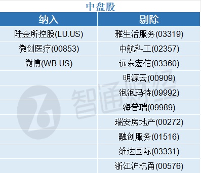 中盘股新纳入陆金所控股(LU.US)、微创医疗(00853)、微博(WB.US),剔除雅生活服务(03319)、融创服务(01516)、浙江沪杭甬(00576)等。