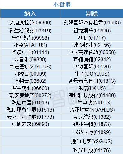 小盘股新纳入安能物流(09956)、亚朵(ATAT.US)、明源云(00909),剔除友联国际教育租赁(01563)、澳优(01717)等。