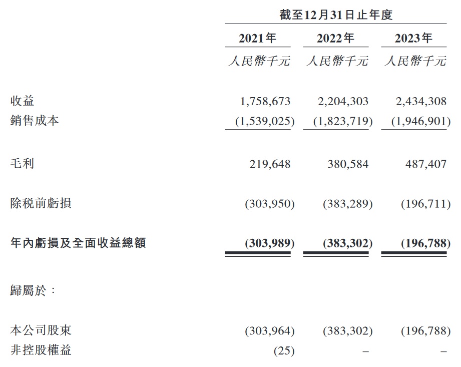 财务方面,截至2021年、2022年及2023年,该公司的收益分别为人民币约17.59亿元、22.04亿元及24.34亿元。同期,该公司年内亏损分别为人民币约3.04亿元、3.83亿元及1.97亿元。