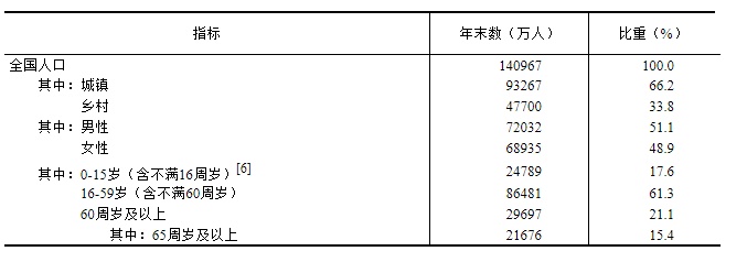 年末全国人口140967万人,比上年末减少208万人,其中城镇常住人口93267万人。全年出生人口902万人,出生率为6.39‰;死亡人口1110万人,死亡率为7.87‰;自然增长率为-1.48‰。