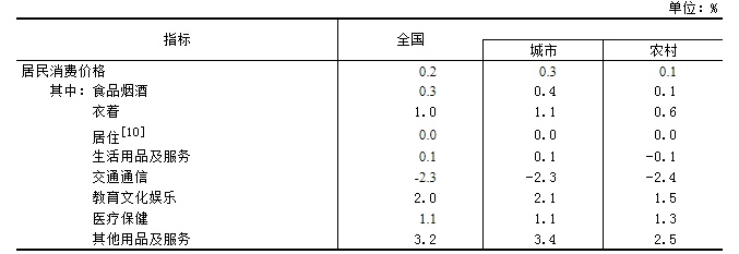 全年居民消费价格比上年上涨0.2%。工业生产者出厂价格下降3.0%。工业生产者购进价格下降3.6%。农产品生产者价格下降2.3%。12月份,70个大中城市中,新建商品住宅销售价格同比上涨的城市个数为20个,持平的为2个,下降的为48个;二手住宅销售价格同比上涨的城市个数为1个,下降的为69个。