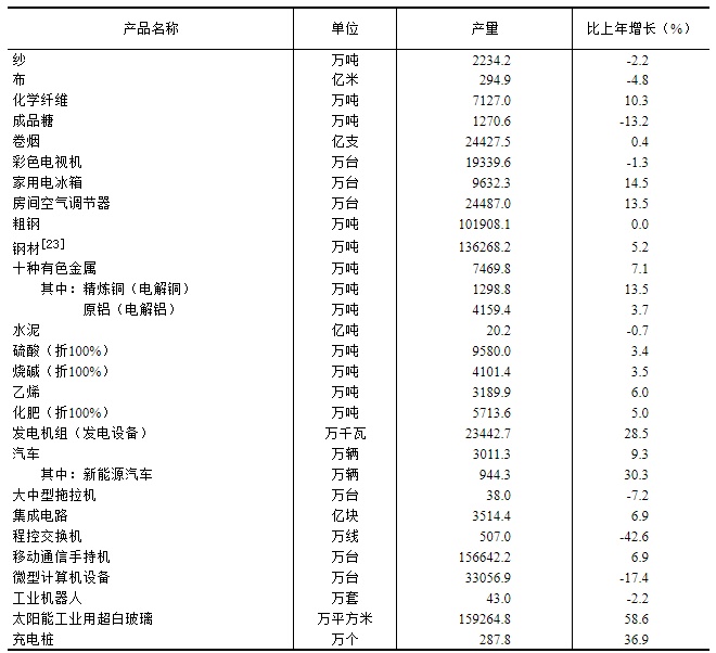 全年规模以上工业中,农副食品加工业增加值比上年增长0.2%,纺织业下降0.6%,化学原料和化学制品制造业增长9.6%,非金属矿物制品业下降0.5%,黑色金属冶炼和压延加工业增长7.1%,通用设备制造业增长2.0%,专用设备制造业增长3.6%,汽车制造业增长13.0%,电气机械和器材制造业增长12.9%,计算机、通信和其他电子设备制造业增长3.4%,电力、热力生产和供应业增长4.3%。