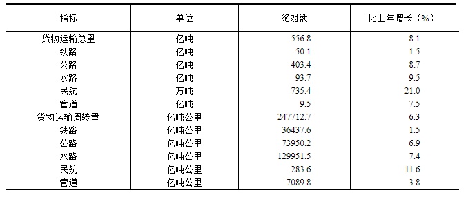 全年货物运输总量557亿吨,比上年增长8.1%。货物运输周转量247713亿吨公里,增长6.3%。港口完成货物吞吐量170亿吨,比上年增长8.2%,其中外贸货物吞吐量50亿吨,增长9.5%。港口集装箱吞吐量31034万标准箱,增长4.9%。