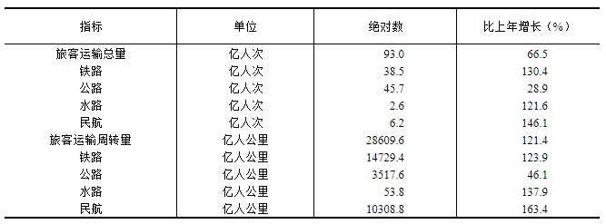 全年旅客运输总量93亿人次,比上年增长66.5%。旅客运输周转量28610亿人公里,增长121.4%。