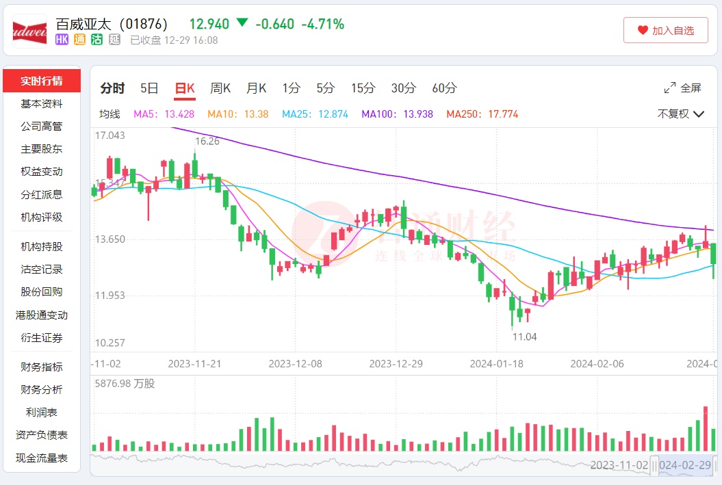 智通财经APP获悉,2月29日,百威亚太(01876)公布截至2023年12月31日止年度业绩,2023财政年度期内收入68.56亿美元,同比增长11.1%,或按呈报基准计增长5.8%;百威亚太股权持有人应占溢利8.52亿美元,同比下降6.7%;每股基本盈利6.45美分,拟派末期股息每股5.29美分。二级市场方面,2月29日,盘初跳水跌超7%,截至发稿,跌6.19%,报12.94港元。