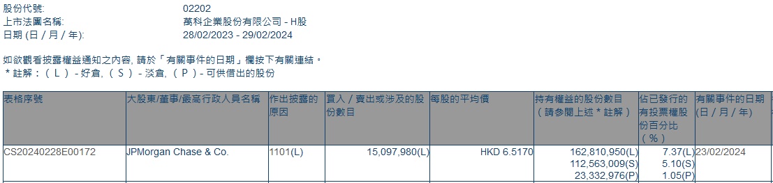 智通财经APP获悉,香港联交所最新资料显示,2月23日,小摩增持万科企业(02202)1509.798万股,每股作价6.517港元,总金额约为9839.35万港元。增持后最新持股数目约为1.63亿股,最新持股比例为7.37%。