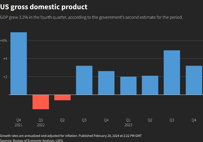 隶属于美国商务部的经济分析局在对第四季度GDP增长数据的修正报告中表示,上季度GDP年化季率修正至3.2%,仅略低于此前公布的3.3%。接受媒体调查的经济学家们原本预计GDP增速不会被修正。私人库存投资目前修正后的数据显示以663亿美元的速度增长,而不是之前报告的827亿美元。库存投资则拖累了GDP约0.3%,而不是最初预期的增加0.1%。