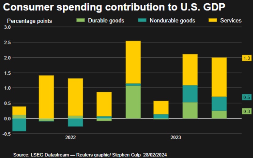 “第四季度的消费者支出组合明显转向更多的最终需求,”来自Brean Capital的高级经济顾问Conrad DeQuadros表示。“这一修正可能将略微提高市场对第一季度美国经济增长的乐观预期。”