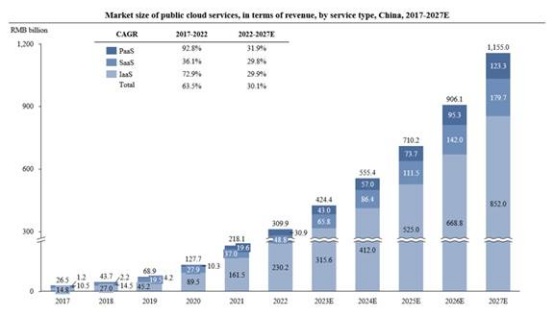 从行业未来空间看,据CIC数据,我国公有云服务市场规模2017年至2022年的复合年增长率为63.5%,于2022年达到3099亿元人民币;预计2027年将达到人民币11550亿元,2022年至2027年复合年增长率为30.1%。