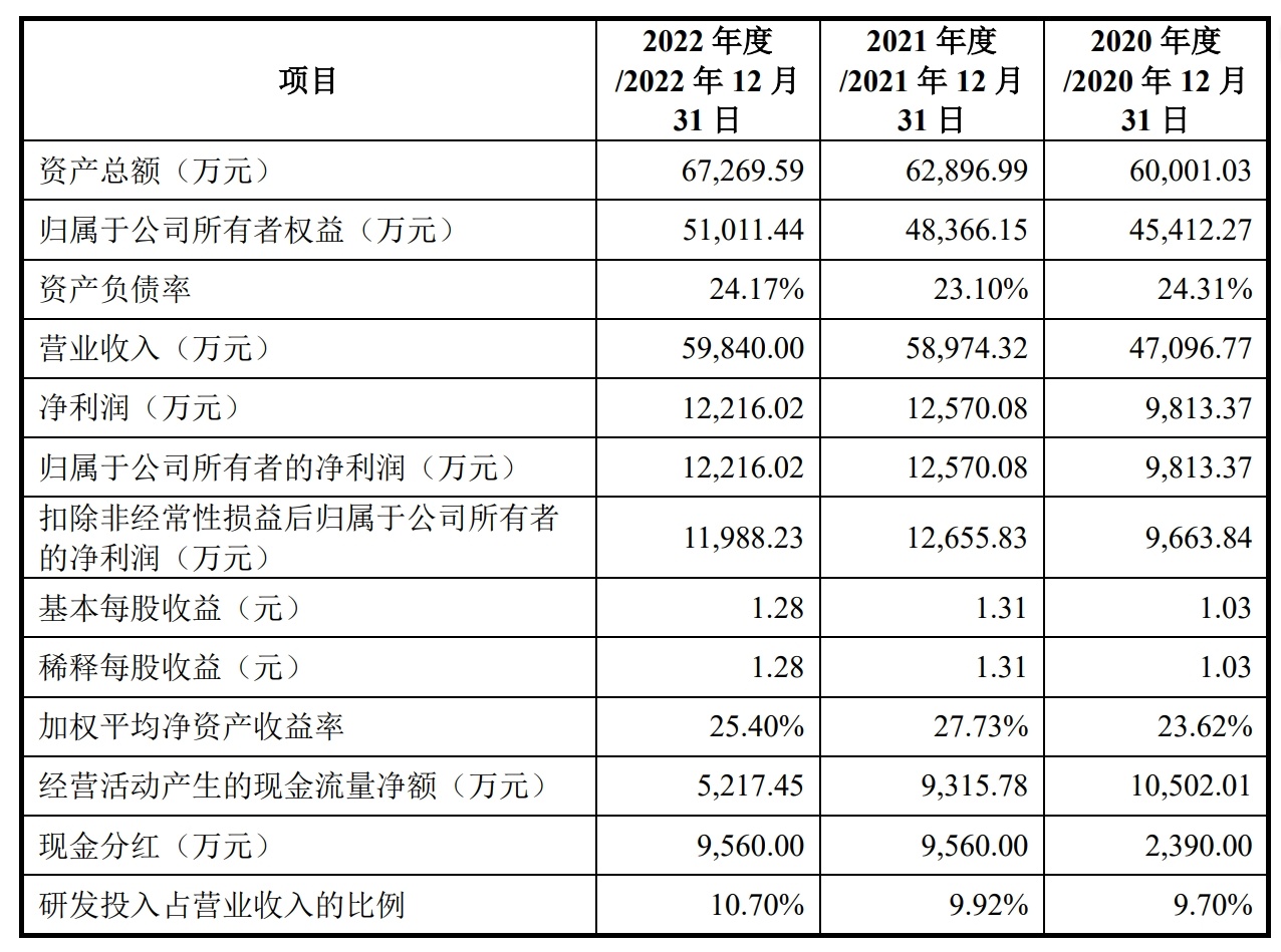 财务方面,于2020年、2021年、2022年,公司实现营业收入分别约为4.71亿元、5.90亿元、5.98亿元;同期,公司实现净利润分别约为9813.37万元、1.26亿元、1.22亿元。
