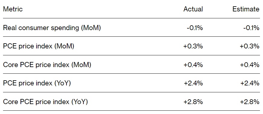 智通财经APP获悉,美联储最青睐的潜在通胀指标——核心PCE,在1月份以近一年来最快的速度上升,支持了美联储的政策制定者们对于降息时机继续持“谨慎态度”。周四公布的数据显示,剔除波动较大的食品和能源成分的核心个人消费支出价格指数(即核心PCE指数)较去年12月环比上涨0.4%,与经济学家预期一致,前值则为0.1%。与一年前相比,核心PCE指数则同比上涨了2.8%,同样与经济学家预期一致,相比于12月数据有所降温。美联储主席鲍威尔曾多次强调,核心PCE是一个比整体CPI指数更好的衡量潜在通胀的指标。