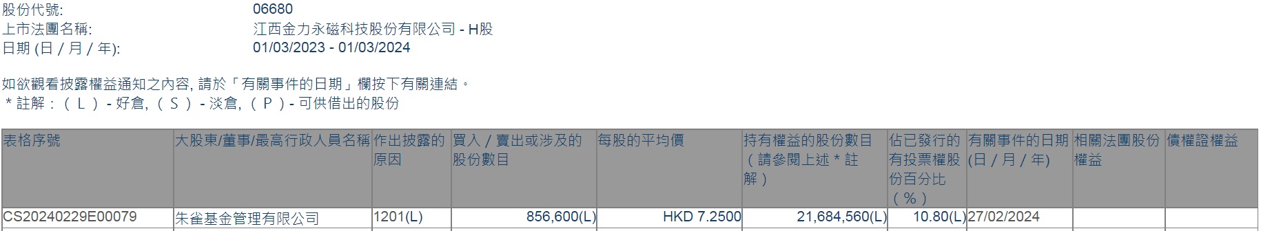 智通财经APP获悉,香港联交所最新资料显示,2月27日,朱雀基金减持金力永磁(06680)85.66万股,每股作价7.25港元,总金额约为621.04万港元。减持后最新持股数目为2168.46万股,最新持股比例为10.8%。