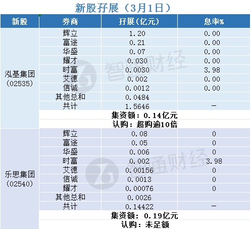 智通财经APP获悉,泓基集团(02535)、乐思集团(02540)正在招股中。截至3月1日,辉立、富途等券商合计为泓基集团借出孖展1.5646亿港元,超购逾10倍;为乐思集团借出孖展0.14422亿港元,认购未足额。