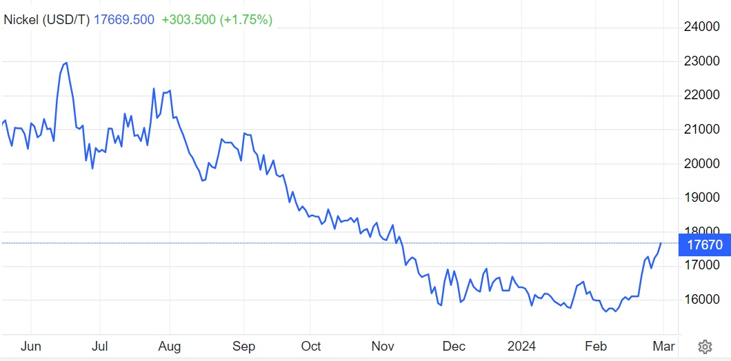 伦敦金属交易所(LME)三个月期的镍期货价格最新交投于每吨17,669美元,上月因印尼推迟许可而从谷底上涨超10%。这使得该金属成为LME金属价格中今年迄今表现最好的六大金属。