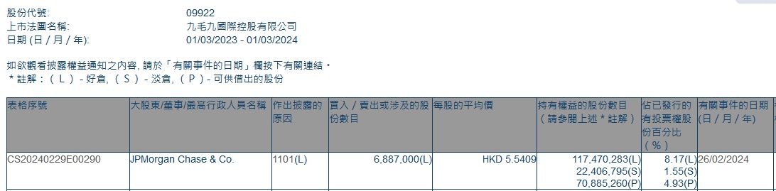 智通财经APP获悉,香港联交所最新资料显示,2月26日,小摩增持九毛九(09922)688.7万股,每股作价5.5409港元,总金额约为3816.02万港元。增持后最新持股数目约为1.17亿股,最新持股比例为8.17%。