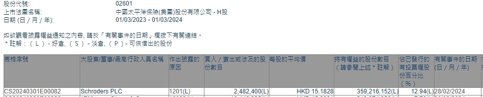 智通财经APP获悉,香港联交所最新资料显示,2月28日,Schroders PLC减持中国太保(02601)248.24万股,每股作价15.1828港元,总金额约为3768.98万港元。减持后最新持股数目约为3.59亿股,最新持股比例为12.94%。