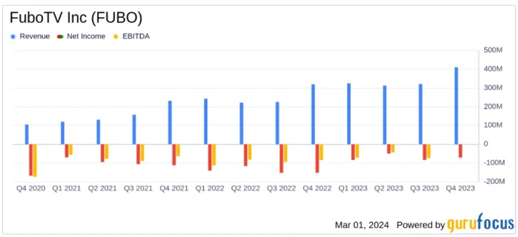 智通财经APP获悉,周五美股盘前,FuboTV(FUBO.US)公布了2023年第四季度业绩。财报显示,FuboTV第四季度营收4.10亿美元,同比增长28.5%,较市场预期高出1237万美元;净亏损7104.2万美元,上年同期为9591.5万美元,每股亏损0.24美元,上年同期为0.48美元,调整后每股亏损为0.17美元,市场预期每股亏损为0.31美元。