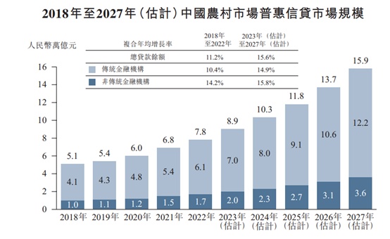 乘着政策的东风,中国农村普惠信贷市场规模从2018年的人民币5.1万亿元增长至2022年的7.8万亿元,2018年至2022年的复合年均增长率为11.2%。随着近年来农村经济稳中向好,如人均可支配收入、人均消费支出在2018年到2022年的增速分别较城镇市场快41%和110%,从中蕴含着巨大的增长潜力。