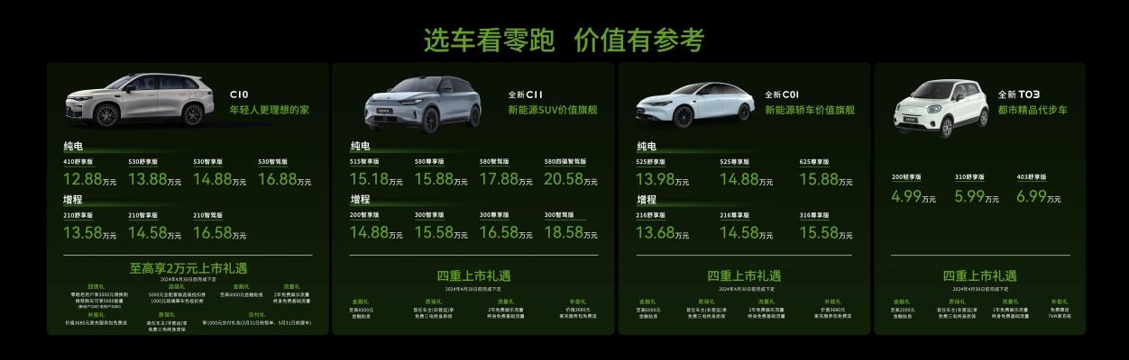 “选车看零跑,价值有参考”,在过去的一年里,零跑依托全域自研,在15-20万元大众化新能源市场树立全新价值标杆。此次零跑全家桶诚意满满,C10正式上市并开启交付,全新的T03/C11/C01配置全面升级,并分别于3月底、4月底及5月初交付。零跑全家桶增配减价“开卷”,势必让行业掀起一波大降价浪潮。
