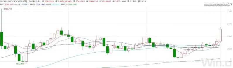 3月1日,国际金价大涨,伦敦现货黄金以2082.395美元/盎司的价格收盘,这是自去年12月下旬以来的最高水平,近期美国的经济数据低于预期,为黄金提供了上涨的空间。