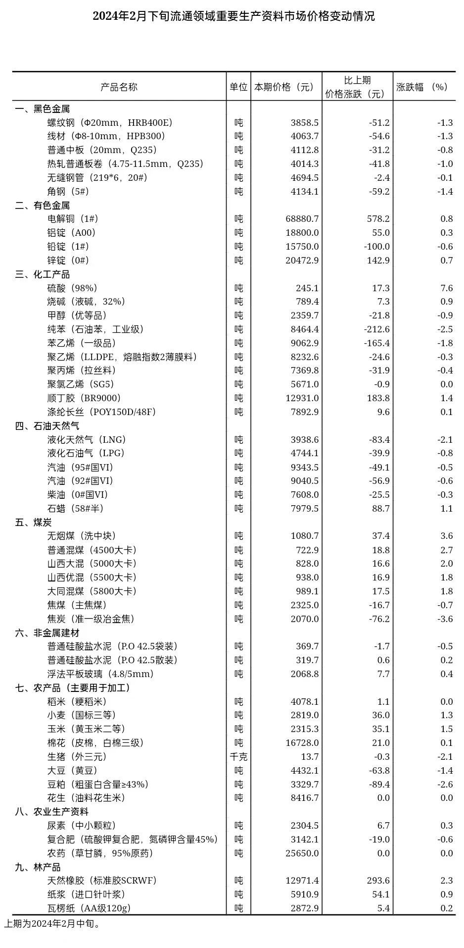 智通财经APP获悉,3月4日,据国家统计局对全国流通领域9大类50种重要生产资料市场价格的监测显示,2024年2月下旬与2月中旬相比,22种产品价格上涨,24种下降,4种持平。其中,生猪(外三元)价格较上期下降2.1%,报13.7元/千克。