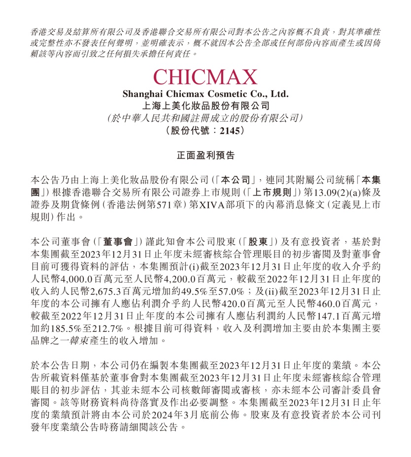 智通财经APP获悉,2024年3月1日,上美股份(02145)发布盈喜。公告显示:预计2023年全年收入约人民币40亿—42亿元,较2022年同比增长约49.5%—57.0%。2023年度,公司拥有人应占利润约人民币4.2亿元至人民币4.6亿元,较2022年度的人民币1.47亿元同比增加约185.5%—212.7%。