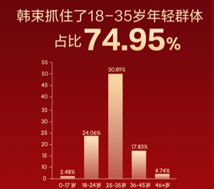 第二,韩束抓住了中国最好的黄金消费群体,抖音渠道18-35岁的年轻群体占比达74.95%。黄金消费群体的高转化率,为品牌销售大底盘提供了稳定输出,同时不断突破品牌增长边界。