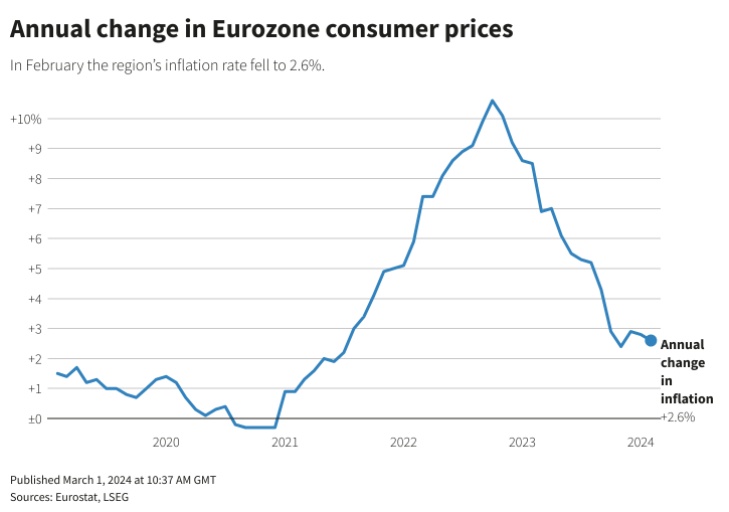上周五,欧盟统计局公布的数据显示,欧元区20国的通胀率从1月的2.8%降至2月份的2.6%,市场预期为2.5%。