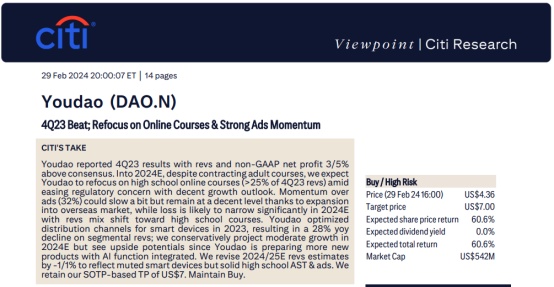 花旗报告特别强调,重点关注网易有道的高中学习业务。2 月 8 日《校外培训管理条例(征求意见稿)》催化下,行业边界日益清晰,网易有道将会在高中课程方面的重点发力,预计将会给2024年Q1季度带来同比25%的高速增长,同时花旗预计Q1季度有道在学习服务业务上的增长将与全年的13%增长率持平。