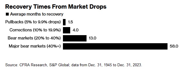 为了正确看待市场下跌,CFRA Research首席投资策略师Sam Stovall建议,将股市历史视为“虚拟的镇静剂”。他表示:“人们对股市从一次回调或10%至20%的下跌中恢复平衡的观点让我惊讶。大多数人会说是几年,但实际上平均需要四个月左右。”