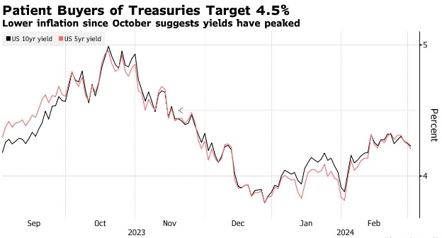 尽管年初美债收益率上升给交易员带来痛苦,然而他们仍在寻求抢购美国国债,因为他们一直认为美国经济最终将在2024年放缓。美国经济在2024年初的表现普遍好于预期,促使投资者大幅降低对美联储降息的押注,并让年初看好债券的投资者蒙受了损失。美国经济的弹性并不是首次让交易员措手不及。对一些人来说,这是一个投降的理由,他们接受了利率在更长时间内更高的现实,以及收益率可能再次上升——甚至达到去年达到的5%的高点。