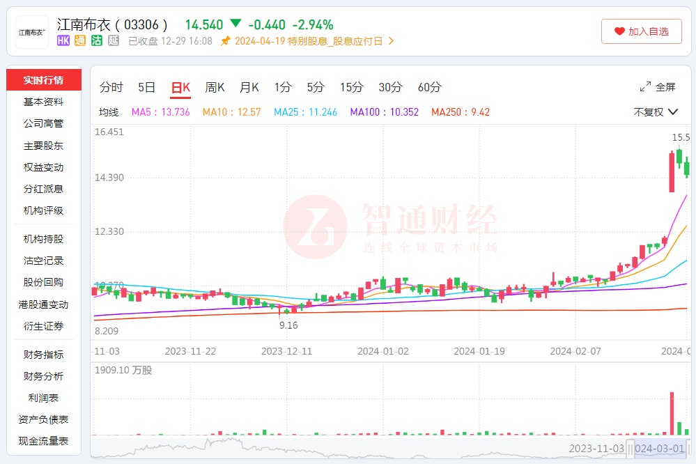 受此优秀财报提振,隔日(2月28日)江南布衣便录得了26.6%的大涨表现。虽然后两天没有延续涨势,但走势业不算很弱。截止3月1日收盘,其股价报于14.54港元。