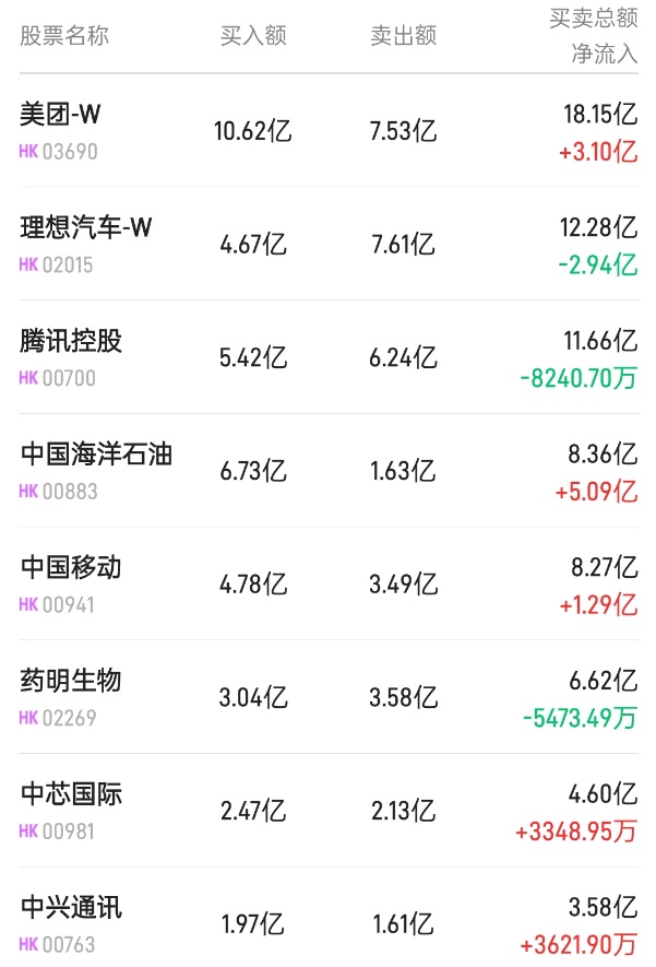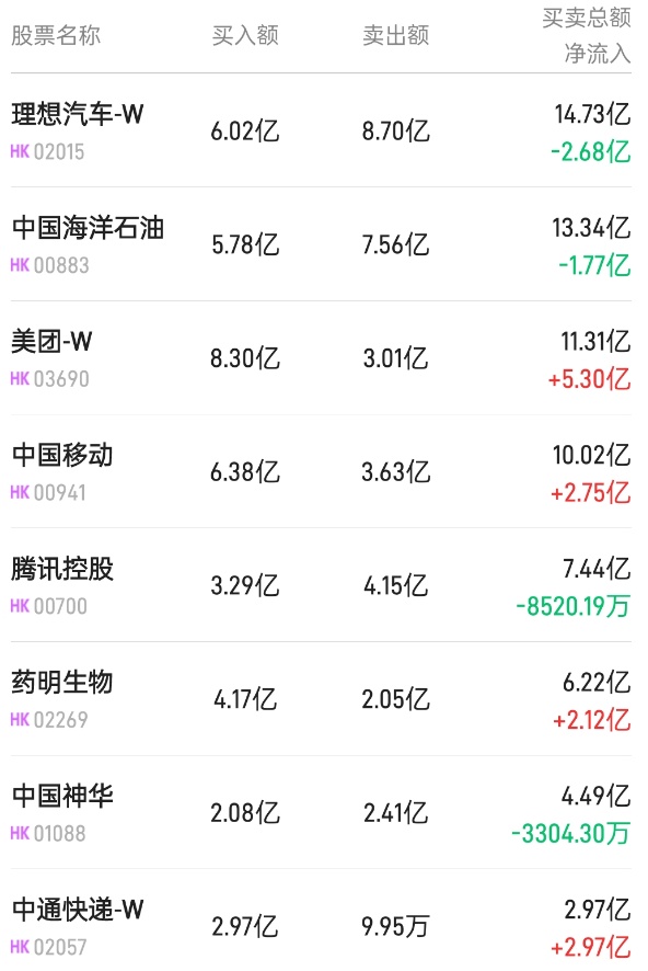 北水净买入最多的个股是美团-W(03690)、中国移动(00941)、中海油(00883)。北水净卖出最多的个股是理想汽车-W(02015)、腾讯(00700)、招商银行(03968)。