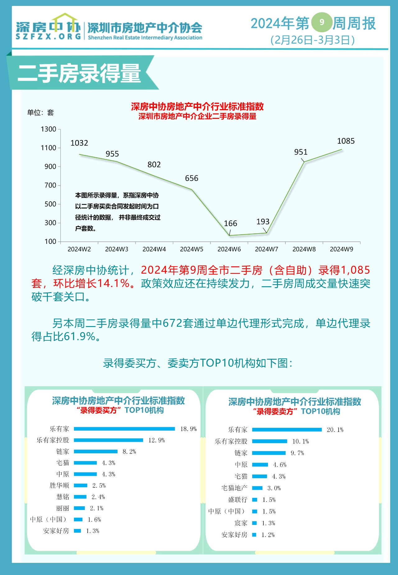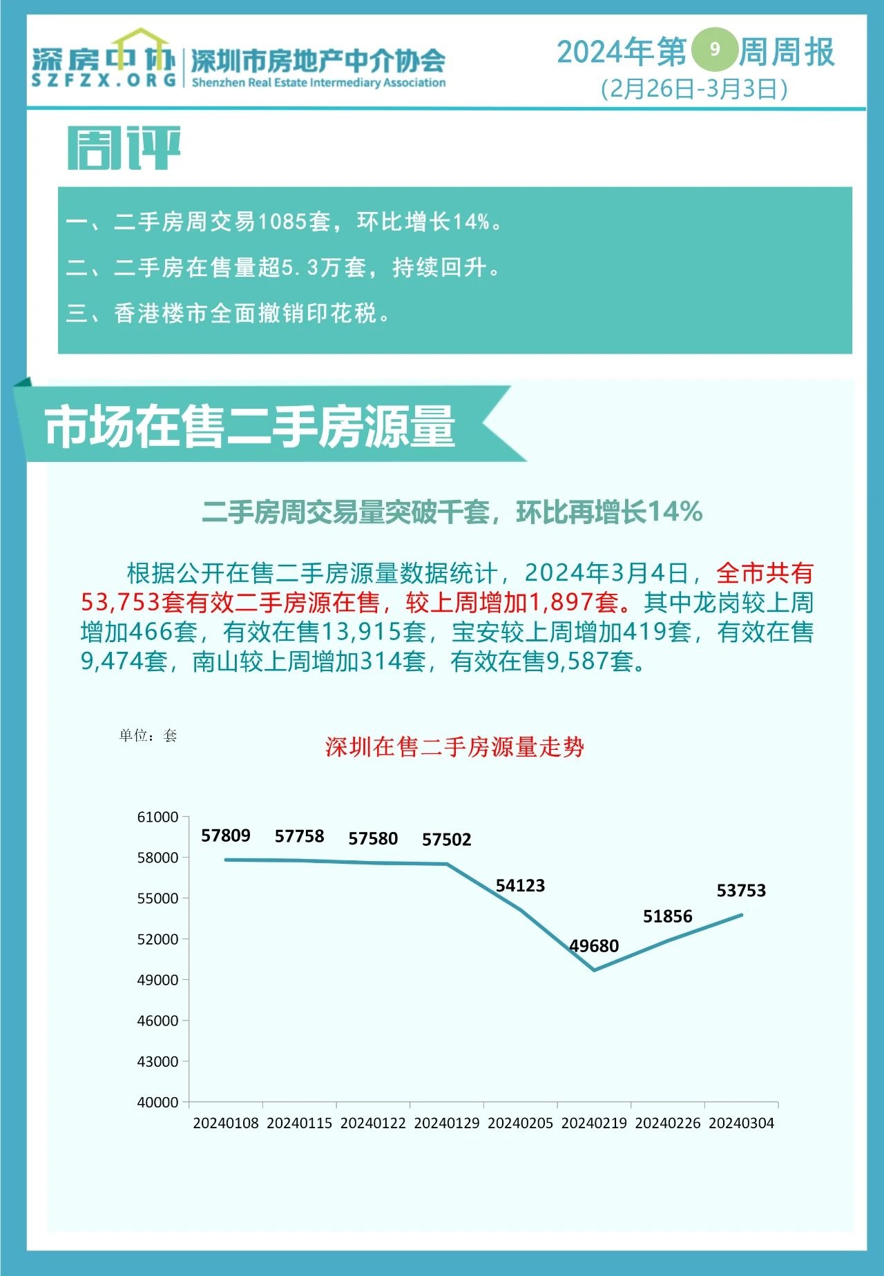 智通财经APP获悉,3月4日,深圳市房地产中介协会发布数据,2024年3月4日,全市共有53753套有效二手房源在售,较上周增加1897套。2024年第9周(2月26日—3月3日)全市二手房交易量(含自助)录得1085套,环比增长14.1%。政策效应还在持续发力,二手房周成交量快速突破千套关口。