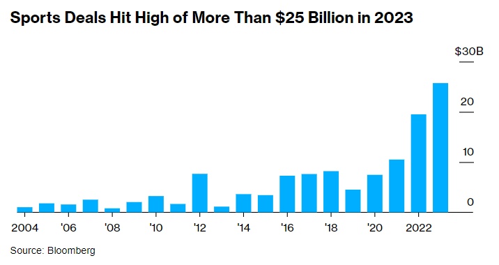 智通财经APP获悉,Bloomberg汇编的数据显示,投资银行在2023年促成约250亿美元的体育相关并购,使该行业的交易价值连续第三年打破记录。