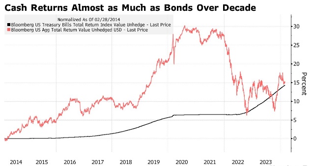 自2021年以来,美国债券市场的损失非常严重,几乎抹去了过去10年相较于现金市场的任何额外收益。包括美国国债和投资级公司债在内的彭博美国综合指数在截至今年2月的10年里为投资者带来了15%的回报率,而相当于现金的美国国库券(期限较短)的回报率为14%。