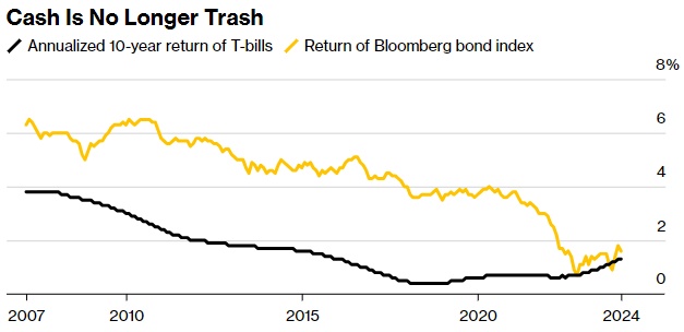 在截至2020年的10年间,彭博债券指数的年回报率为3.8%,而美国国库券的年回报率为0.7%。随着疫情的爆发,这种情况发生了变化,飙升的通胀促使美联储将目标利率上调至5.25%至5.5%的区间,这是2001年以来的最高水平。债券市场崩溃,现金再次成为可投资的资产类别。