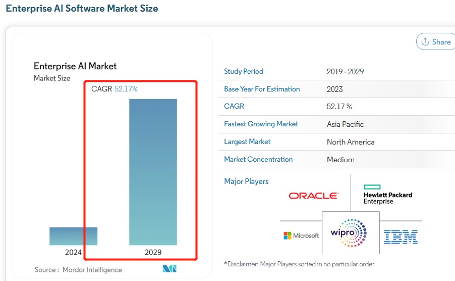 在多数华尔街投资机构看来,企业端的AI应用将走在AI软件大爆发的最前沿端。预期方面,Mordor Intelligence研究报告显示,预计到2029年,企业人工智能市场的总规模将以每年52%的速度快速增长。