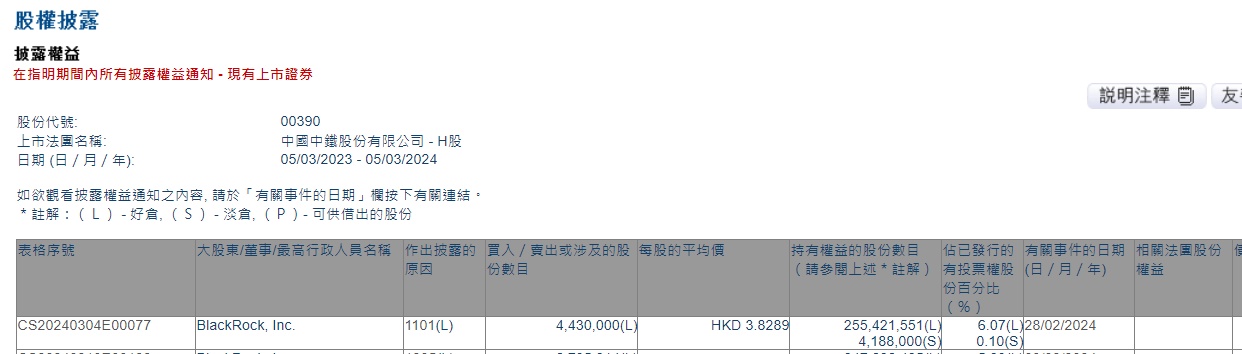 智通财经APP获悉,香港联交所最新资料显示,2月28日,贝莱德增持中国中铁(00390)443万股,每股作价3.8289港元,总金额约为1696.20万港元。增持后最新持股数目约为2.55亿股,最新持股比例为6.07%。