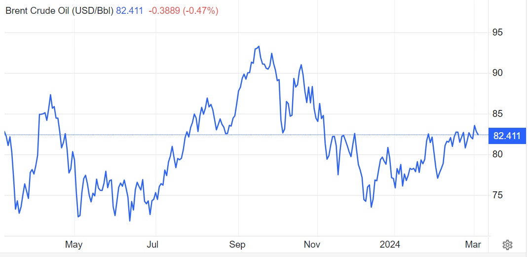欧佩克+事实上的领导者沙特阿拉伯将继续自愿减产100万桶/日,而俄罗斯将再减产47.1万桶/日。这些削减措施在正式宣布前市场基本上已全面定价,刺激布伦特原油价格自2月中旬以来小幅走高。当前布伦特原油交易价格约为每桶82美元,较年初上涨约8%。