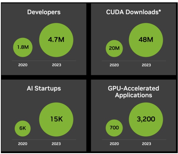 除此之外,英伟达的CUDA软件包也为Nvidia GPU上的计算任务提供了基础,帮助加速深度学习框架,并支持AI推理应用程序的开发和部署。这促使更多第三方开发者为Nvidia GPU开发兼容的AI推理应用,进一步丰富了英伟达的软件生态系统。到2023年底,CUDA软件包已累计下载4800万次,证明了其广泛的用户基础和开发者社区的活跃度。