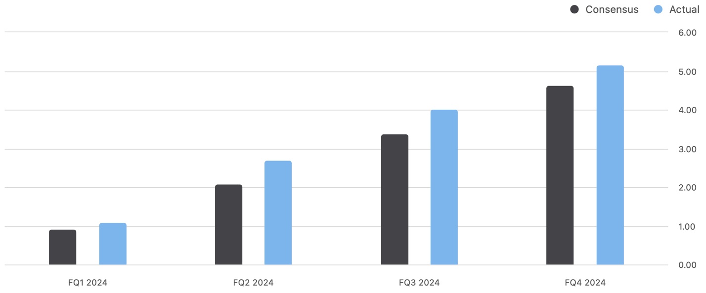 最后,从英伟达财务表现和股价估值的角度看,该公司在2024财年的每个季度表现超出市场预期,第四季度年同比增长265%,预计2025财年第一季度收入为240亿美元,同比增长234%。公司以其市场领先的AI计算GPU获得了强大的定价能力,H100 GPU的售价约为40,000美元,带来了显著的利润率提升,毛利率达到76%,远超AMD和Intel。