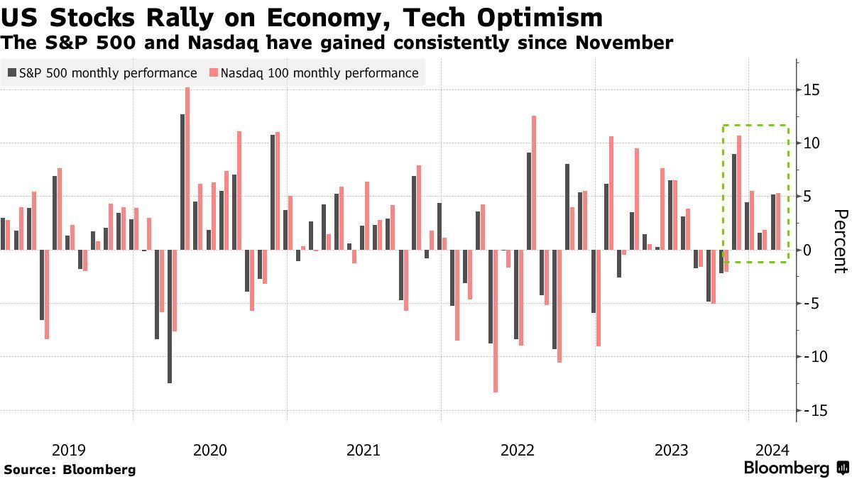 美国股市今年一直在上涨,围绕人工智能的热潮和对经济增长的乐观情绪推动标普500指数创下历史新高,以科技股为主的纳斯达克100指数则已连续4个月上涨。