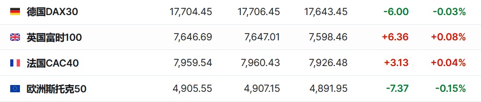 2.截至发稿,德国DAX指数跌0.03%,英国富时100指数涨0.08%,法国CAC40指数涨0.04%,欧洲斯托克50指数跌0.15%。