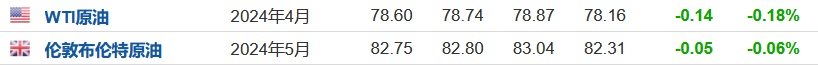 3.截至发稿,WTI原油跌0.18%,报78.60美元/桶。布伦特原油跌0.06%,报82.75美元/桶。